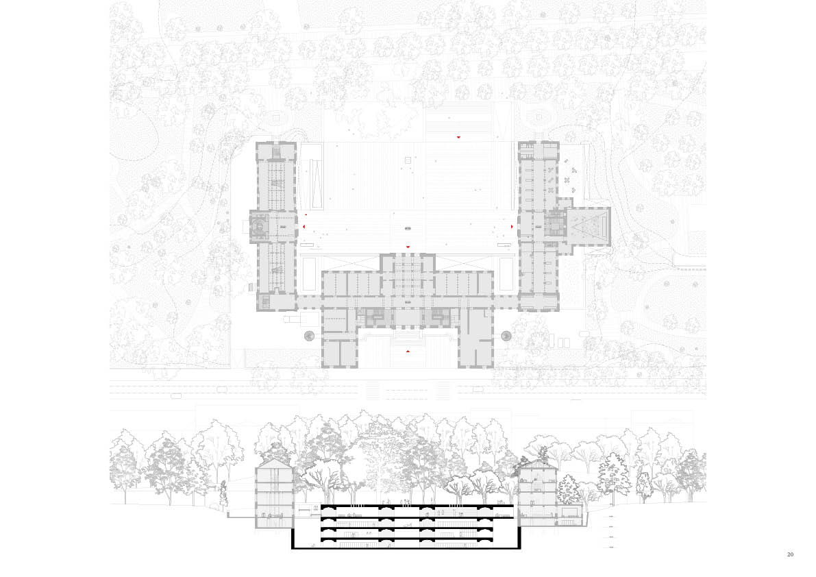 Our proposal intends to create an extension that preserves the existing neo-classical setting of the university buildings within the historic landscape of Parc des Bastions. The idea is to make an invisible extension which lies inconspicuously within the plaza’s boundaries and has minimal impact on the surrounding landscape.