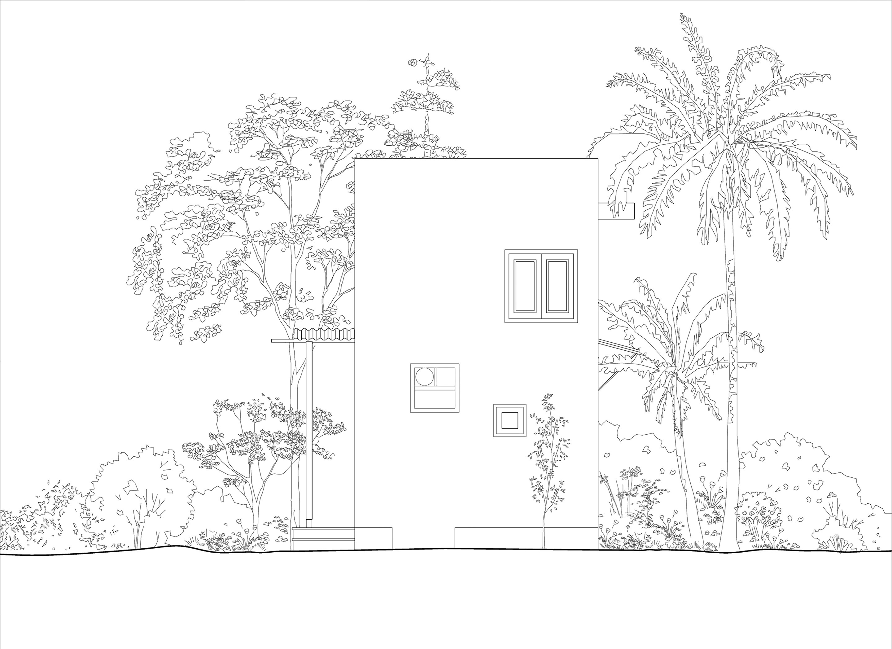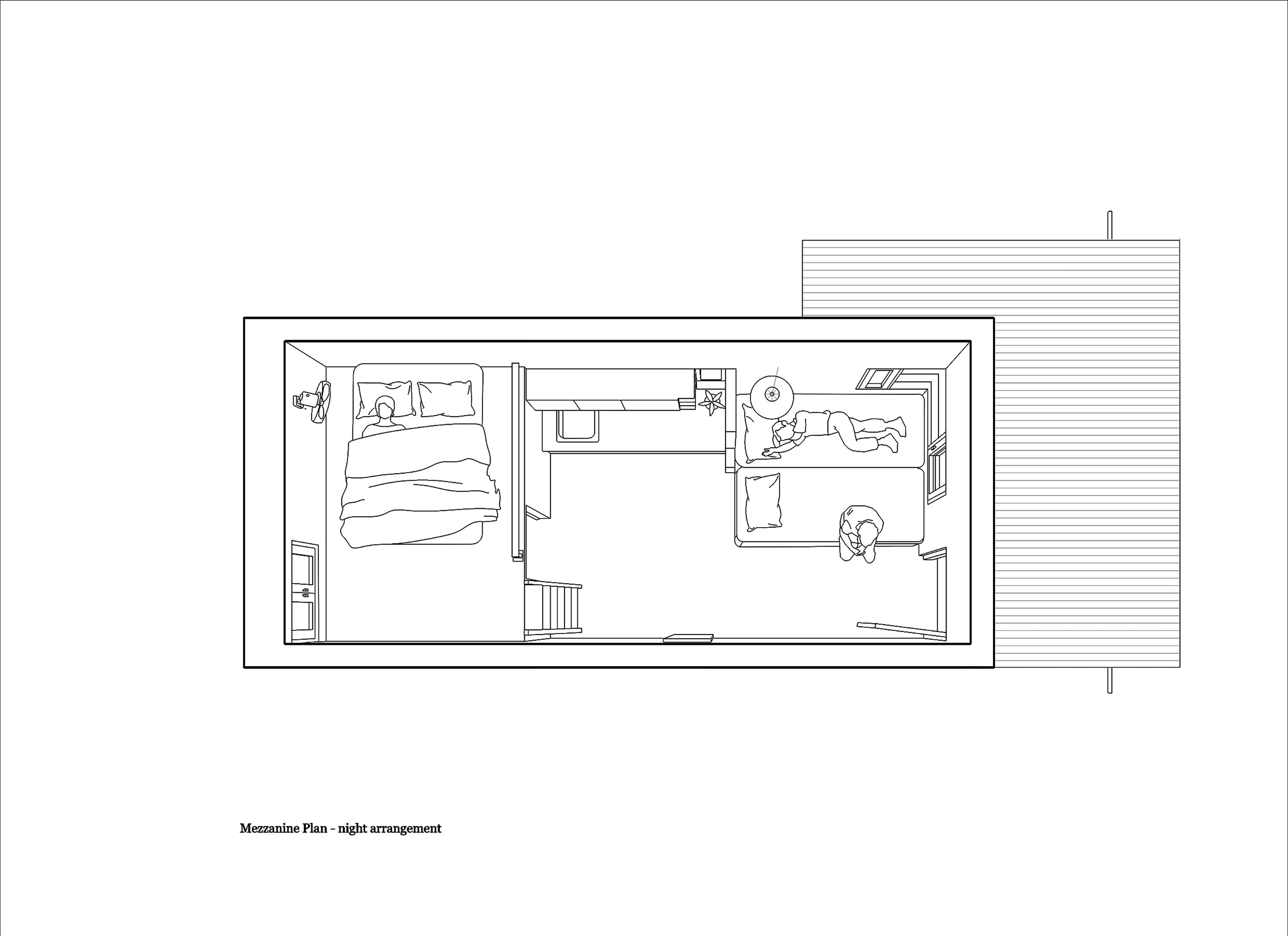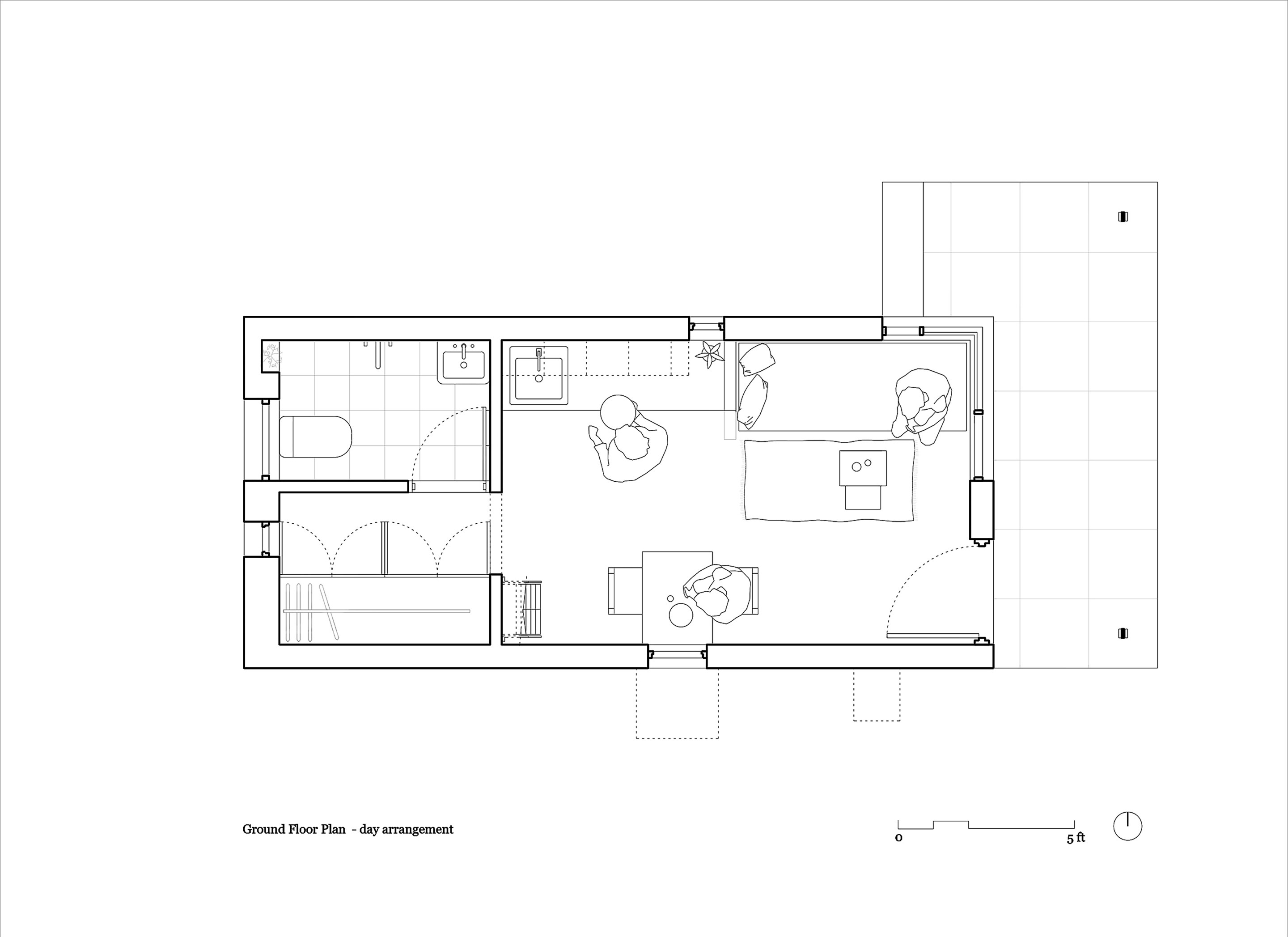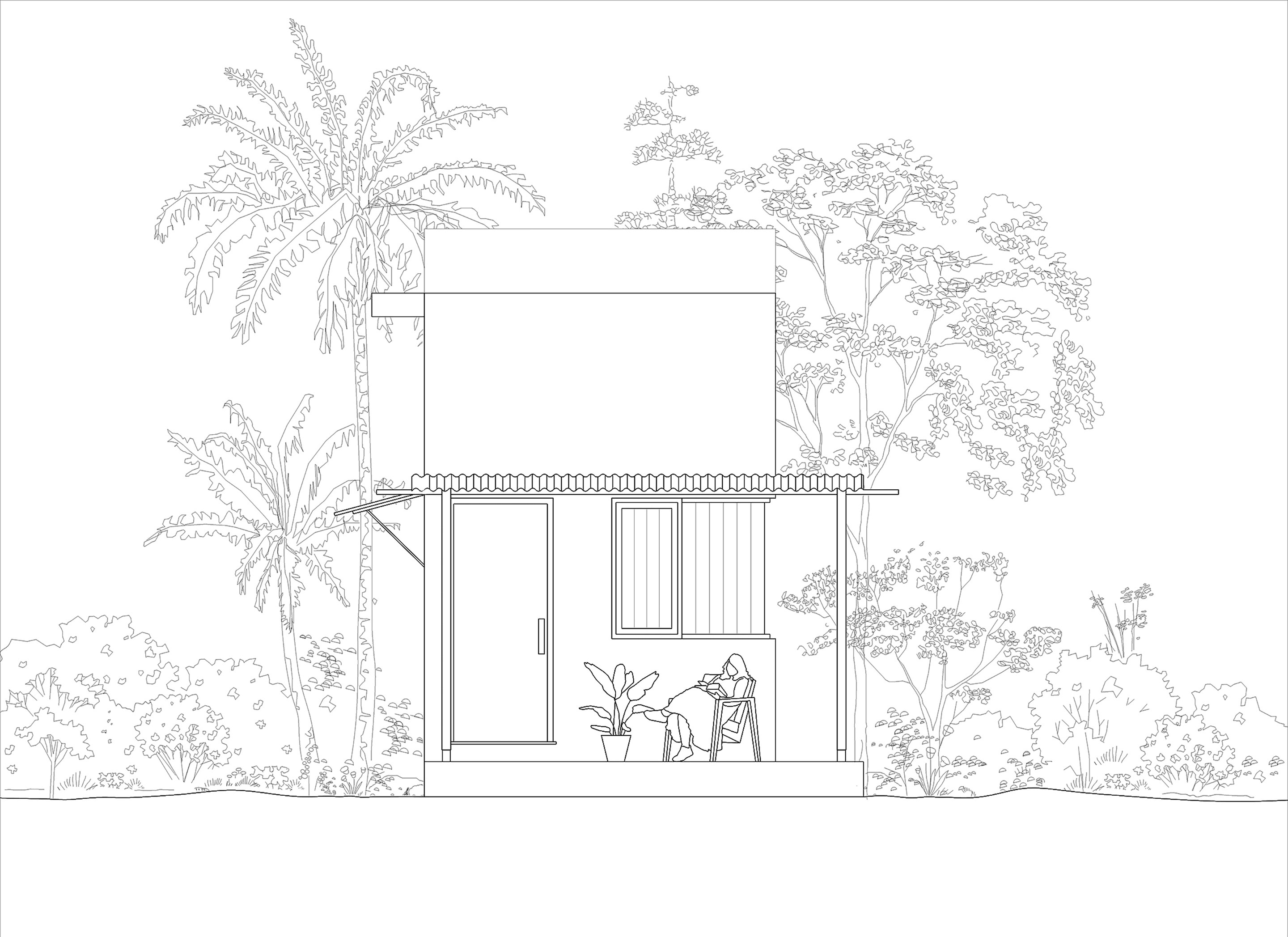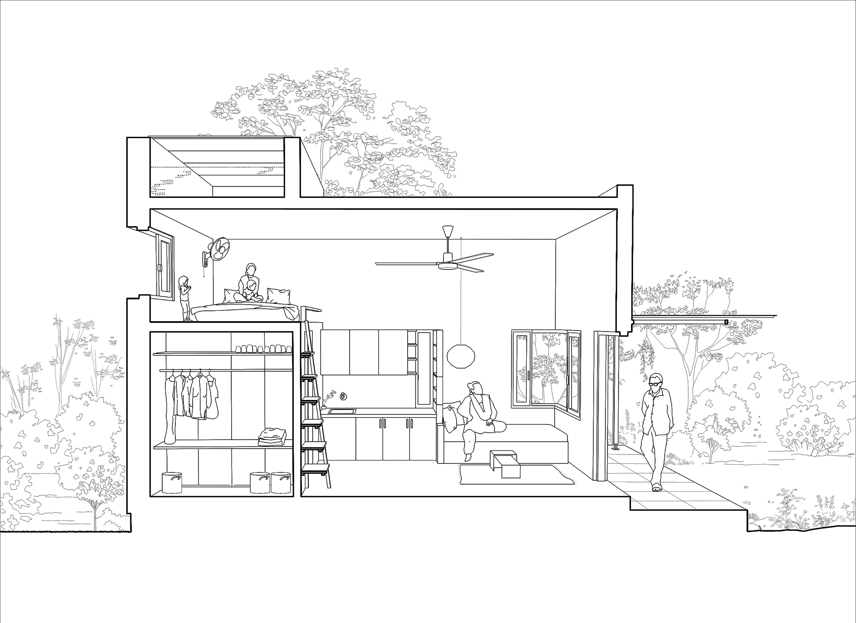 The house is accessed through a semi-open space on the east and includes a large, multifunctional interior volume. A toilet and storage area are tucked beneath a mezzanine floor to the west. This layout transcends the conventional housing template of separate living, dining and sleeping spaces in favour of ideas of multifunctionality. The main living space is equipped with a daybed cum sofa and flexible seating, functioning as a living area by day and transforming into an open bedroom with a pull-out double bed by night. A foldable table opposite the kitchen serves as both a dining area and a study space.
